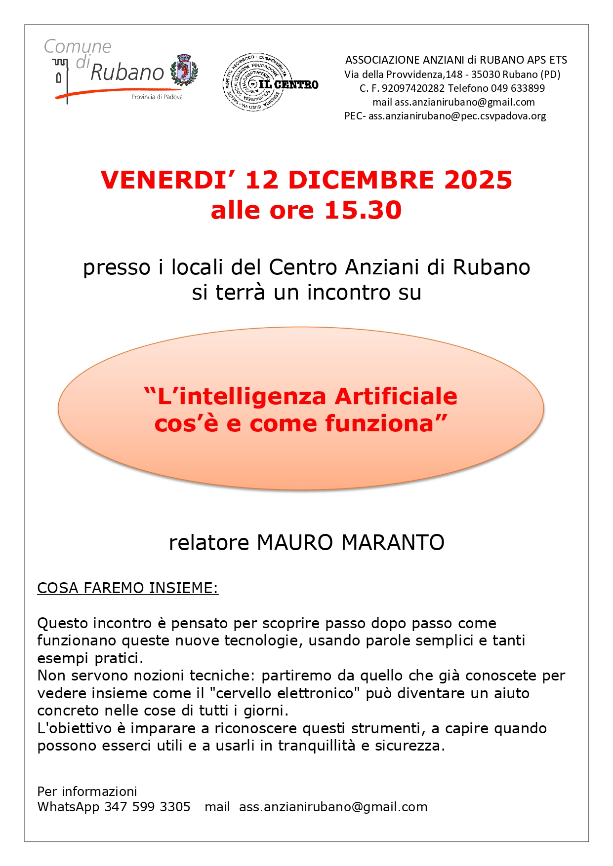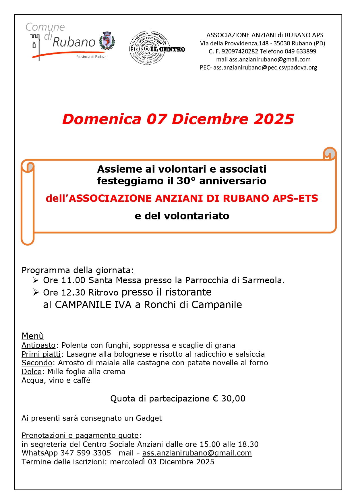 Per partecipare alle attività ricreative, culturali, sportive e sociali proposte in sede e alle visite guidate a città, borghi, e luoghi storici, di notevole interesse storico, artistico e naturalistico e frequentare il Centro Anziani è necessario essere iscritti all'Associazione Anziani di Rubano versando la quota sociale annuale di € 10,00. Le principali attività e i servizi offerti dal Centro sono: SERVIZIO DI MOBILITA' DEBOLE: un gruppo di volontari accompagnano con i mezzi messi a disposizione del Comune, le persone svantaggiate o con difficoltà motorie, residenti nel territorio, presso gli ambulatori e centri fisioterapeutici per terapie o visite specialistiche SERVIZIO TELEFONO INCONTRO: ogni mattina delle volontarie chiamano a casa delle persone non autosufficienti per portare una parola di conforto e amicizia GRUPPO PITTURA: soci che ogni martedì si incontrano e, con la guida di un maestro, apprendono l'arte della pittura (con esposizione dei loro quadri) GRUPPO CANTO - coro FILI D'ORO: soci che guidati da un maestro, ogni giovedì sera provano sia canti sacri che popolari, con esibizioni nelle funzioni religiose o in altre manifestazioni GRUPPO TEATRO: soci che preparano delle commedie dialettali, da rappresentare nelle varie feste, o durante le visite agli ospiti di istituti di riposo GRUPPO FOLLERAU: socie che confezionano coperte di lana da spedire nei paesi poveri CORSO DI ACQUAGYM nelle piscine termali del comprensorio termale ( trasporto organizzato in pulman sino alla piscina per chi lo desidera) L'Associazione collabora anche con l’A.C.V.R. - Associazione di Coordinamento del Volontariato di Rubano nella gestione del banco di solidarietà che da più di un anno assiste con prodotti alimentari le famiglie bisognose del Comune di Rubano. Dal 2015 l'Associazione Anziani organizza, con grande partecipazione, i soggiorni climatici estivi al mare ed in montagna riservati agli anziani del territorio. Inoltre, le altre attività ricreative, riguardano visite a città, borghi, e luoghi storici, di notevole interesse storico, artistico e naturalistico mentre, per due volte al mese, nella sala riunioni della sede sono proposte delle conferenze con argomenti relativi alla storia, di attualità, alla salute, alla sicurezza o ambientale, coadiuvati da professionisti delle discipline trattate.