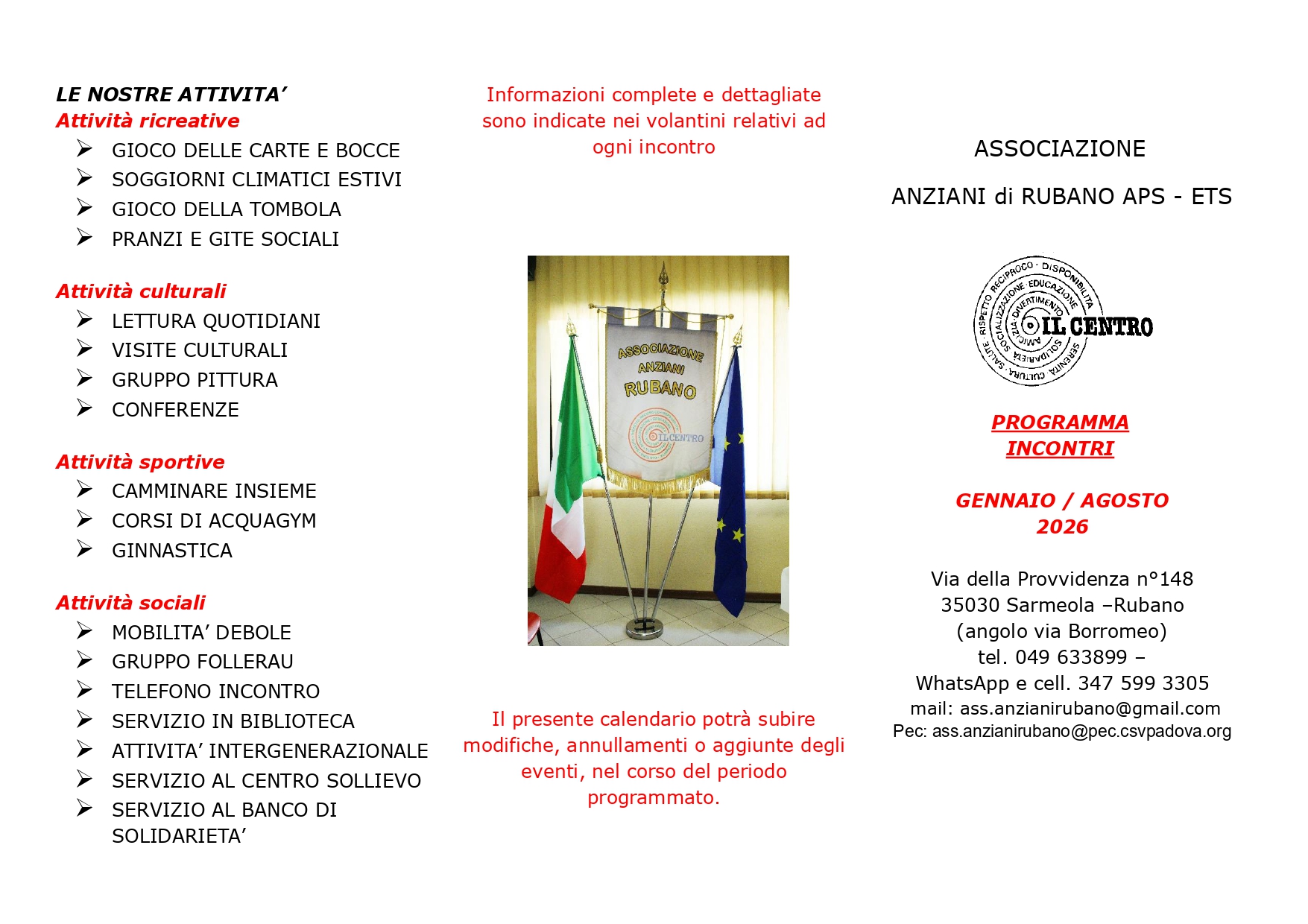 Programmi ed incontri da gennaio ad agosto 2026 presso il Centro Anziani di Rubano.