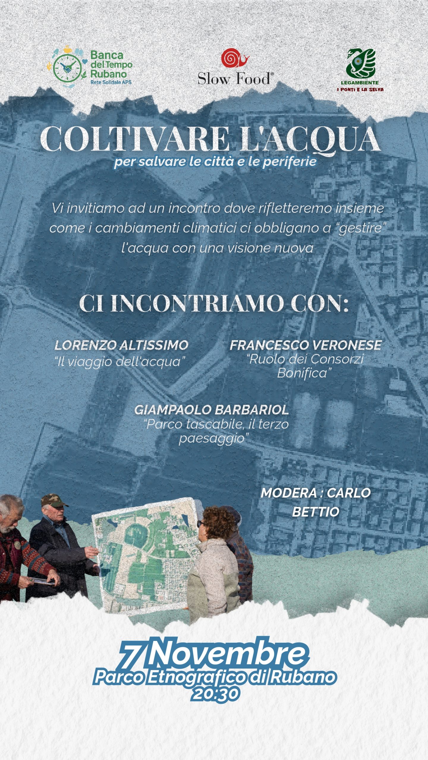 La BANCA DEL TEMPO DI RUBANO, in collaborazione con l’associazione “SLOW FOOD” e “LEGAMBIENTE I PONTI E LA SELVA”, organizza un incontro, aperto a tutti, venerdì 7 novembre 2025 alle ore 20:30, presso il Parco Etnografico di Rubano, in cui si rifletterà sui cambiamenti climatici che ci obbligano a “gestire” l’acqua con una visione nuova.
