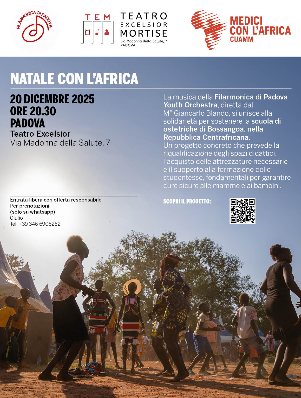 La Filarmonica di Padova, in collaborazione con Medici con L’Africa CUAMM, organizza presso il Teatro Excelsior di Mortise, sito in via Madonna della Salute n.7 a Padova, alle ore 20:30 del 20 dicembre 2025, il concerto “NATALE CON L’AFRICA”.
